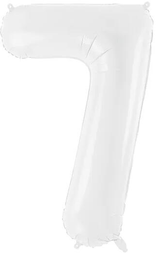 Fólia lufi, 86 cm, 7-es szám alakú, fehér. Héliummal vagy levegővel fújható, önzáró szelepes. Egyedi eurófüles csomagolásban.