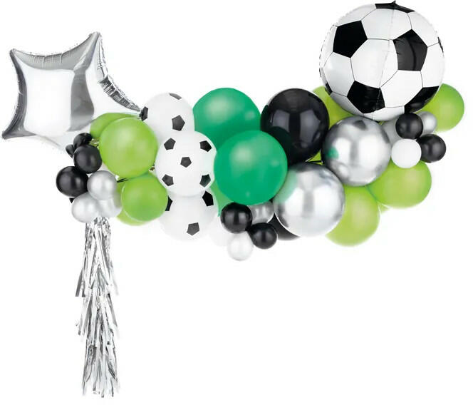 Ez a szett egy igazi focirajongó partijáról nem hiányozhat! A szett tartalma: 1db fólia lufi csillag 1db fólia lufi focilabda 1db rojt 46db latex lufi 33db kiegészítő a készítéshez