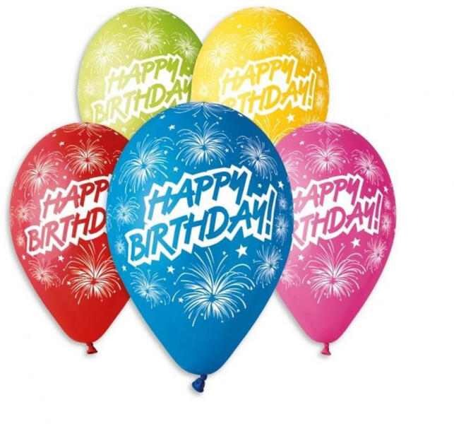Happy Birthday léggömb, lufi 5 db-os Anyaga: latex/gumi Mérete: 12 inch (30 cm) A lufi tartó pálca + csésze külön megvásárolható áruházunkban.