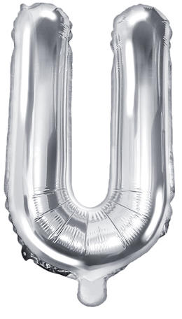 Fólia léggömb, 'U' betű, csak levegővel tölthető, önzáró szelepes, egyesével csomagolva. A rajta lévő fülecskék segítségével rögzíthetőek. Magassága: 35 cm. Színe: ezüst.