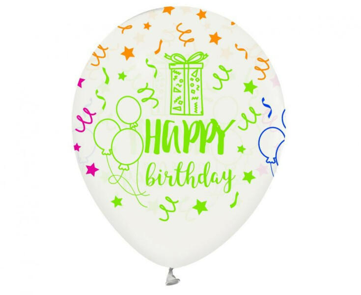 Happy Birthday Colorful léggömb, lufi 5 db-os 12 inch (30cm) Anyaga: latex/gumi Mérete: 30 cm (12 inch) A lufi tartó pálca + csésze külön megvásárolható áruházunkban ( KFJ_DPA9911929vagyKFJ_DPA9917359 ).