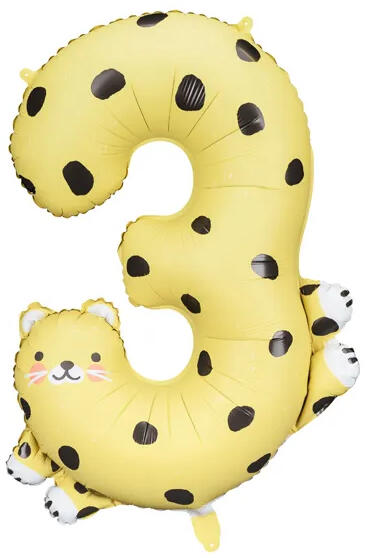 Fólia lufi, 90 cm, 3-as szám alakú, Leopárd formájó. Héliummal és levegővel fújható, önzáró szelepes. Egyedi eurófüles csomagolásban.