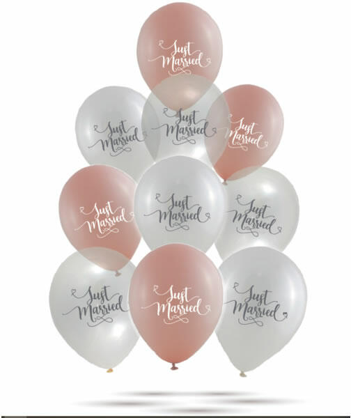 Lufi, Just Married felírattal. Átlátszó és rose gold színekben, vegyesen csomagolva, 32 cm átmérő. 10 darab / csomag.