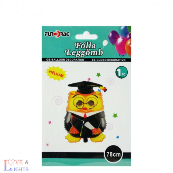 Bagoly mintás ballagási fólia lufi Felfújható : levegővel vagy héliummal Mérete: 78 cm magas A csomag tartalma: 1 db lufi + 1 db szívószál a felfújáshoz