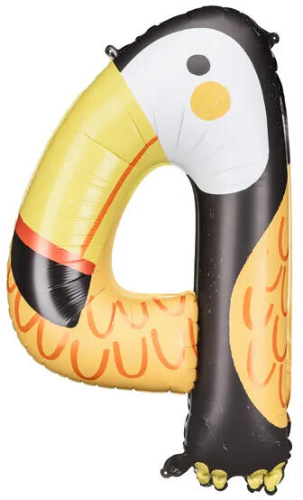 Fólia lufi, 90 cm, 4-es szám alakú, Tucán formájó. Héliummal vagy levegővel fújható, önzáró szelepes. Egyedi eurófüles csomagolásban.