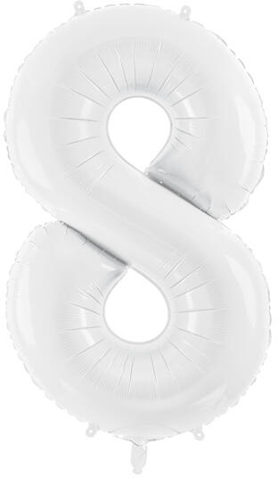 Fólia lufi, 86 cm, 8-as szám alakú, fehér. Héliummal vagy levegővel fújható, önzáró szelepes. Egyedi eurófüles csomagolásban.