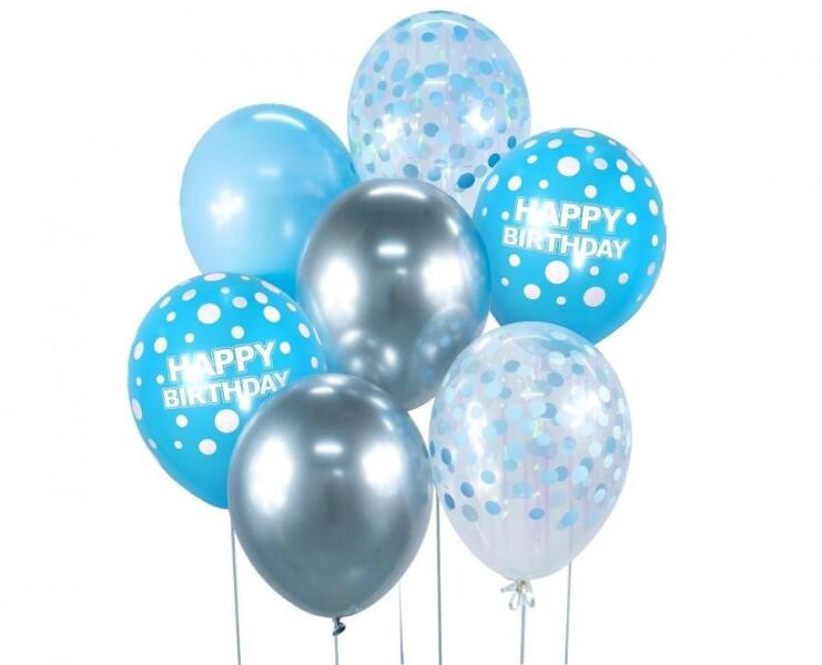 Happy Birthday Silver-Blue, Ezüst-Kék léggömb, lufi szett 7 db-os 30cm (12 inch) Mennyiség: 7db Mérete: 30cm (12 inch) Anyaga: latex/gumi A lufi tartó pálca + csésze külön megvásárolható áruházunkban (DPA9911929).