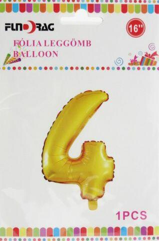 4-es születésnapi szám fólia lufi - arany 86cm mennyiség: 1 db méret: 86 cm alkalmas levegővel illetve héliummal történő felfújásra Színesítse a születésnapi ünnepséget szám formájú fólia lufikkal . Drágábbak ugyan, mint a klasszikus latex lufik, de előnyük a minőség és a nem áteresztő képesség . A levegővel felfújt fólia lufik jelentősebb változások nélk