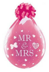 Átlátszó lufi, fehér Mr és Mrs felirattal. A képen a rózsaszín csak a hátteret adja, a lufi átlátszó, színtelen.