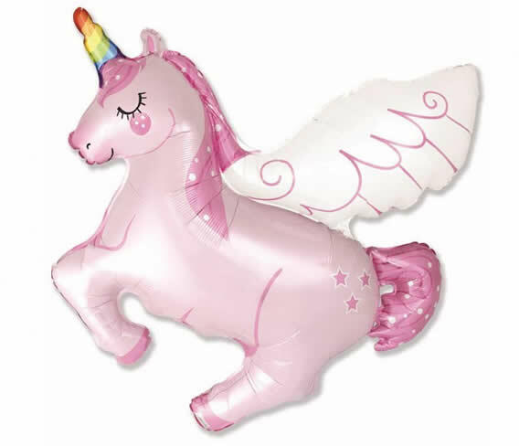 Szivárvány szarvú pink unikornis, mérete 24" (90cm*80cm). Önzáró szelepes. Tölthető levegővel vagy héliummal. Felfújatlanul szállítjuk.