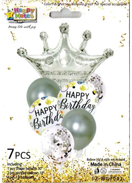 Fólia lufi korona, Happy Birhday és gömb lufi konfettis 7db Termékjellemzők: Anyaga: műanyag Alkalom: Szülinap Figyelmeztetés: Figyelmeztetés: 8 év alatti gyerekek esetén fulladásveszélyes a felfújatlan lufi. ; 3 éves kor alatt nem ajánlott!; Figyelmeztetés: fulladásveszély, kis alkatrészek! Kinek ajánlott: Bárkinek