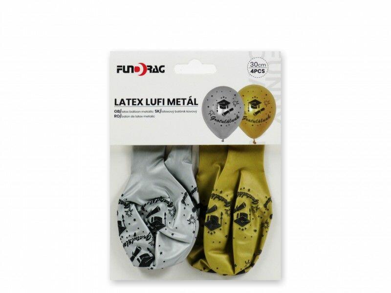 Lufi ballagós Gratulálunk arany/ezüst 4db 30cm 644817 Ballagási party tökéletes kiegészítője ez az arany/ezüst színű, 4 db-os, ballagási, fekete ballagó sapka mintás lufi. Befoglaló méretek 13x0.5x17 cmAnyaga latex