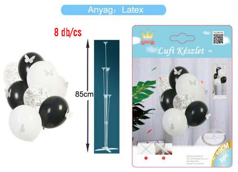 Asztali lufi szett pillangóval 8db fekete és fehér léggömb Dobd fel az ünnepi asztalt ezzel a trendi lufidísszel. A csomagban ehhez mindent megtalálsz. 3db fekete, 3db fehér, 2db áttetsző konfettis léggömb, 5db csillogó papír pillangó és a lufitartó állvány áll rendelkezésedre, hogy egyedi dekorációt alkothass. Könnyedén csodaszép díszítést varázsolhatsz ezzel a szet