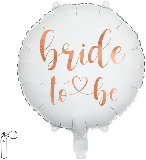 Fólia lufi fehér színben, rosegold színű Bride to be felirattal, felfújás előtti méret kb. 45 cm (18"), méret felfújás után kb. 35 cm (14"). Felfújni levegővel vagy héliummal. A készlet egy szívószálat is tartalmaz a levegővel való felfújáshoz