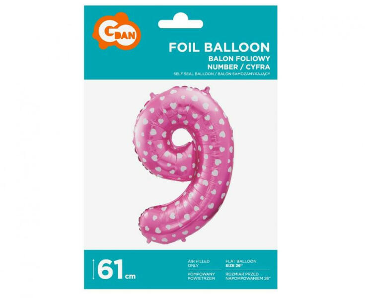 Pink with Hearts, Rózsaszín 9-es szám fólia lufi 61 cmFólia léggömb, mely héliummal vagy levegővel tölthető. A lufi önzárószeleppel van ellátva, amely megakadályozza a gáz elszökését. Méret: 61 cm Anyaga: fólia A lufi tartó pálca + csésze külön megvásárolható áruházunkban. Pink with Hearts, Rózsaszín 9-es szám fólia lufi 61 cmFólia léggömb, mely héliummal va