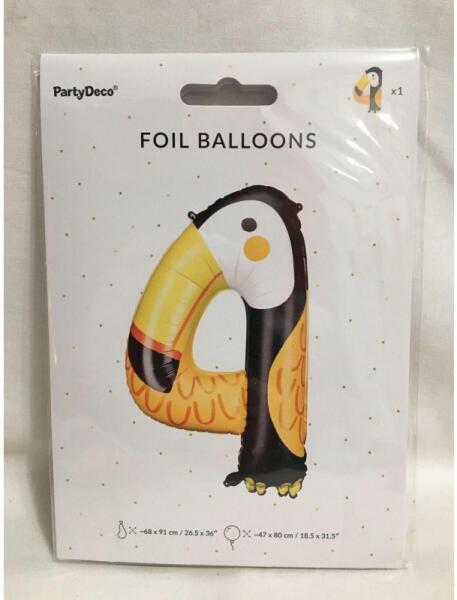 Felfújt állapotban kb. 47x80 cm-es, 4-es szám alakú, tukán madaras állatos fólia léggömb. Héliummal és levegővel is felfújható, önzáró szeleppel ellátott fólia lufi. FIGYELEM! A fólia léggömbök érzékenyek a szélsőséges hőmérséklet változásokra. Hidegben elernyedhetnek, melegebb helyen újra kifeszülhetnek, tágulhatnak, akár el is durranhatnak! A fólia léggömb