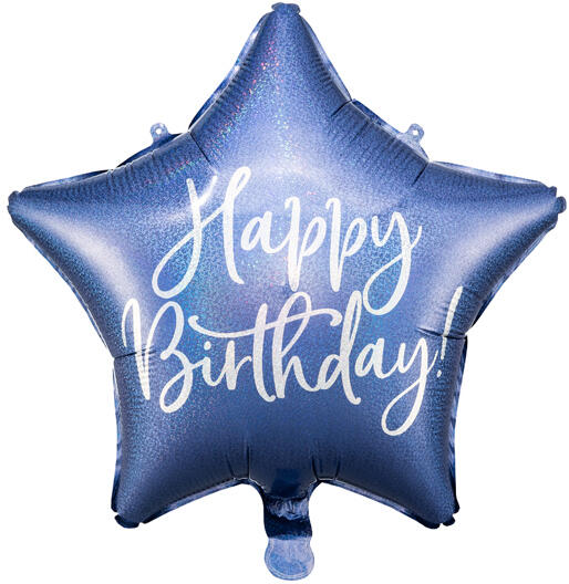 Fólia lufi, 15,5"/40cm, csillag forma, kék-gyöngyház színű. Happy Birthday fehér felirattal. Héliummal vagy levegővel fújható, önzáró szelepes. Egyesével csomagolva.