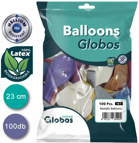 Lufi, metál színekben, levegővel vagy hélium gázzal való feltöltésre alkalmas átmérő: 23 cm. 100 db/csomag.