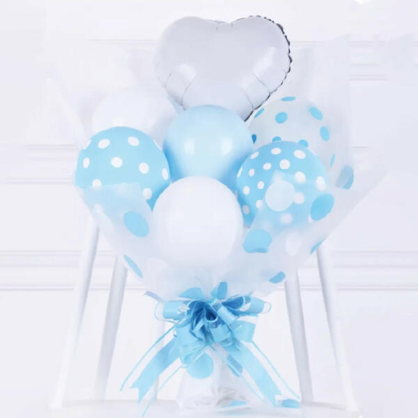 Csokorba köthető, kék színű lufi szett , mely varázslatos dísze lehet születésnapi bulinak, vagy egy babaváró ünnepségnek is. A képen látható csokor elkészítéséhez minden alapanyagot megtalálsz a csomagban, így egy kis kézügyességen és egykézi pumpánkívül másra nincs is szükséged. Tulajdonságok: Anyaga: latex és fólia lufi, papír és műanyag A csomagban talál