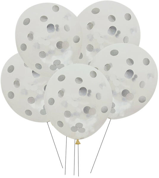 5 darabos latex lufi ezüst konfettivel , mely elegáns kiegészítője lehet minden születésnapi partynak, ballagási vagy éppen esküvői dekorációnak. Tulajdonságok: Anyaga: latex A lufik méretei: 30 cm átmérő Levegővel tölthető lufi. A csomagban 5 darab azonos színű lufi található.