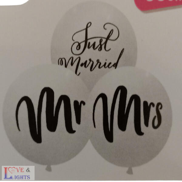 Fehér színű latex lufi 30 cm átmérőjú - Mr & Mrs és Just Married felirattal 5db / csomag 5 db-os lufi szett, egyedi dekoráció esküvőre A lufi szett tartalma: 5 db fehér színű 30 cm átmérőjű latex lufi Mr & Mrs és Just Married felirattal