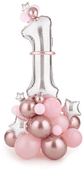 ''1'' számú lufi csokor rózsaszín színben, a készlet tartalma: lufi (28 db), habszalag (10 db), modellező lufi (5 db), papírszalma (1 db), fólia lufi (5 db) és 2,5 db. m léggömbfüzér szalag. Mérete kb. 90 x 140 cm. Kézikönyv mellékelve.