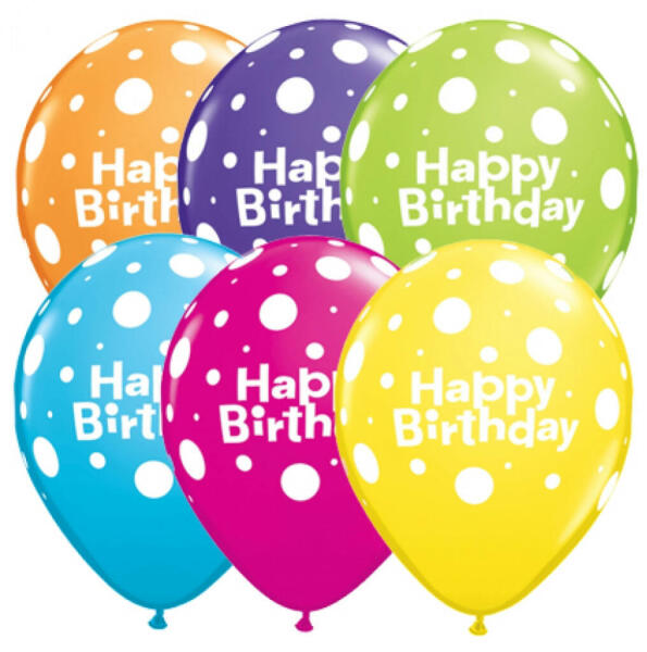 Pöttyös-pettyes, színpompás születésnapi lufi buliba, Happy Birthday felirattal. Pöttyös-pettyes, színpompás születésnapi lufi buliba, Happy Birthday felirattal. A csomagban található színek: Sárga, Narancssárga, Égszínkék, Sötétlila, Vadmálna Rózsaszín, Lime Zöld A csomag tartalma 6db lufi Mérete: 11 inch (28 cm). Anyaga: latex. A Qualatex léggömbök 100%-osan környe