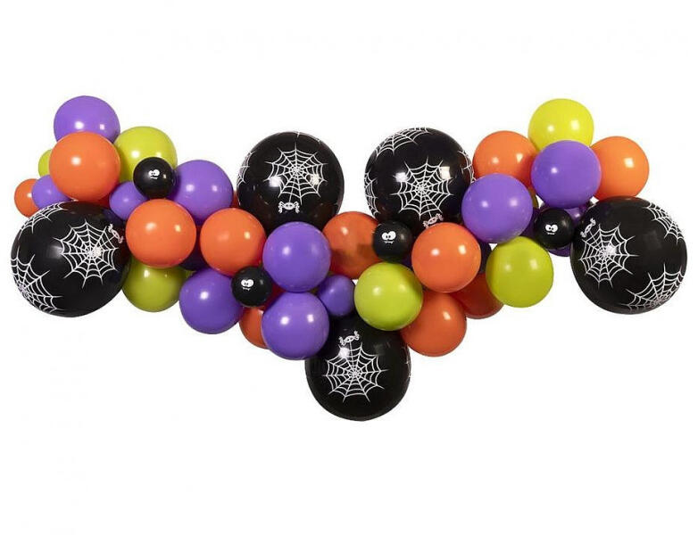 Halloween léggömb, lufi girland szett 65 db-os Anyaga: latex/gumi Tartalma: - 30 db léggömb 10 inch (26 cm) - 30 db léggömb 5 inch (13 cm) - 5 db léggömb 13 inch (33 cm) - szalag - ragasztópöttyök A kész füzér méretei: 200x50x70 cm