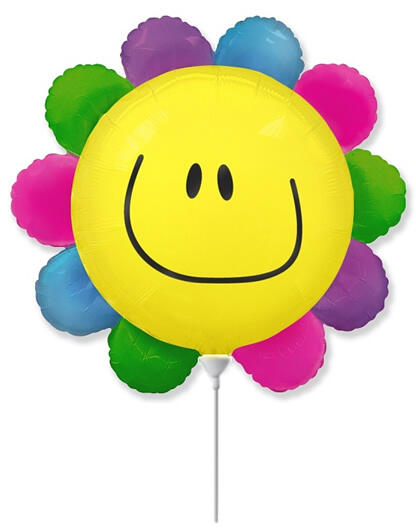 Fólia lufi, mini forma, szivárvány mosolygó virág, 35 cm. Önzáró szelep nélkül, csak levegővel tölthető. Ömlesztett formában, nincs egyesével csomagolva.