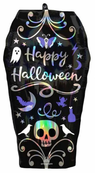Halloween Coffin, Koporsó fólia lufi 68 cm Fólia léggömb, mely héliummal vagy levegővel tölthető. A lufi önzárószeleppel van ellátva, amely megakadályozza a gáz elszökését. Mérete: 38x68 cm Anyaga: fólia A lufi tartó pálca + csésze külön megvásárolható áruházunkban.