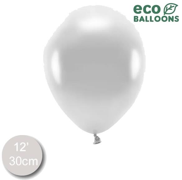 12" Metál ezüst ECO lufi, levegővel vagy gázzal való feltöltésre alkalmas átmérő: 30 cm. 100 db/csomag. Anyaga: Latex.