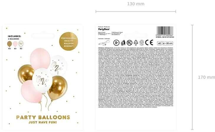 6 db születésnapi lufi "One" felirattal 30cm Pasztell halvány rózsaszín-fehér-arany színben. Léggömbök "Boldog születésnapot neked" felirattal. A készlet 6 db léggömböt tartalmaz: - 2 pasztell tiszta fehér, arany nyomattal, - 2 pasztell halvány rózsaszínben, - 2 fényes arany színben. Átmérője: kb. 30 cm Csomagolás mérete: 13cm x 17cm