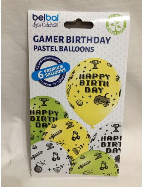 Fehér, zöld és sárga alapon, videójáték mintás, születésnapi latex lufi. A léggömbök mérete felfújt állapotban 30 cm átmérőjű. Héliummal és levegővel is felfújhatóak. Az ár 1 csomag lufira vonatkozik. Egy csomag 6 db lufit tartalmaz.