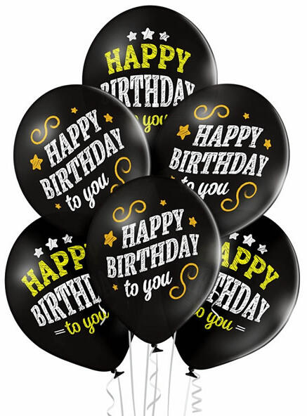 Fekete lufi, Happy Birthday to you felírattal. Átmérő: 30 cm. Tölthető gázzal, levegővel. Teljes felületén mintázott. Egy csomagban 6 db van.