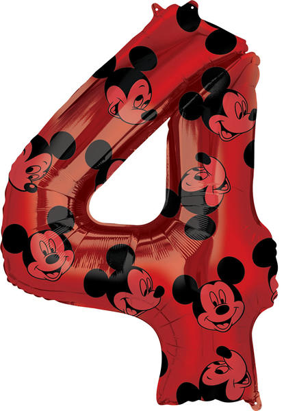 Mickey Mouse Forever fólia lufi, 4. szám. 66 cm magas. Dobja fel a születésnapi ünnepség dekorációját ezzel a szám formájú fólia lufival Mickey motívummal. Ezeket a kiváló minőségű fólia lufikat fel lehet fújni levegővel vagy héliummal. Ha ezt a számos fólia lufit héliummal tölti meg akár 14 napig is lebeghet, az alakja pedig 7 napig változatlan marad.