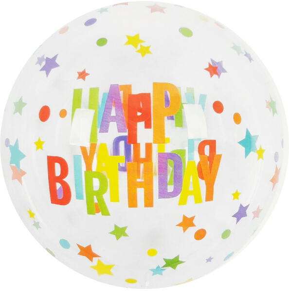 50 cm átmérőjű, gömb alakú buborék lufi Happy Birthday felirattal, mely egy születésnapi party igazán látványos dekorációs kelléke lehet. A buborék lufik különlegessége, hogy majdnem szabályos gömb alakúak és egy különleges celofánhatású műanyagból készülnek, melynek köszönhetően tartósabb minőséget biztosítanak. Tulajdonságok: Anyaga: műanyag A lufi méret