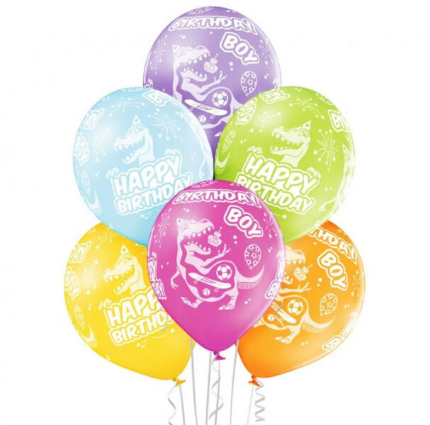 Latex lufi, dínós. 6 db/csomag. 5 színnel, 5 oldalon printelve. Erős lufi. Felfújt állapotban 30 cm átmérőjű. Anyaga: latex. A latex léggömbök 100%-osan környezetbarátak, ugyanannyi idő alatt bomlanak le, mint egy tölgyfalevél. A léggömbök a printelésük miatt héliumos felfújást igényelnek vagy levegővel történő felfújás esetén tartó pálcára rögzíthetőek. A l