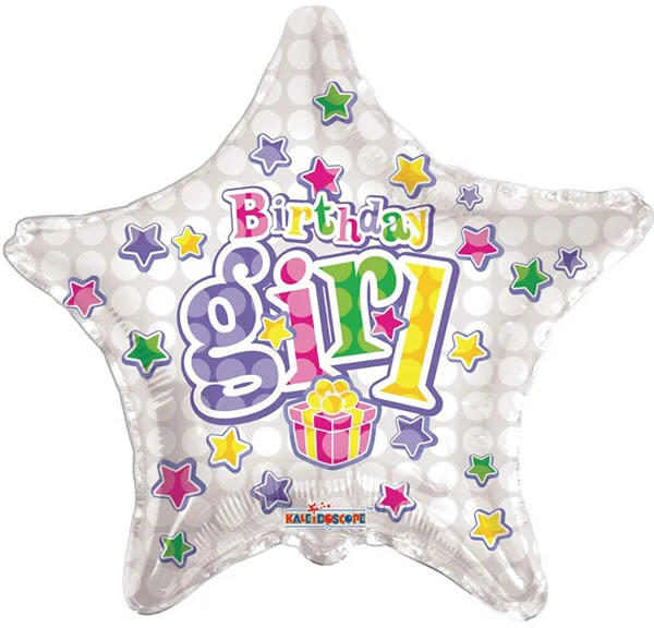 Fólia lufi, 18"/45cm, csillag forma. Birthday Girl felirattal. Újrahasznosított műanyagból készül, célunk az újrahasznosított műanyag százalékos arányának 95% -ra történő növelése! Héliummal vagy levegővel fújható, önzáró szelepes. Egyesével csomagolva.