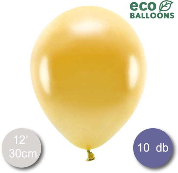 12" Metál arany ECO lufi, levegővel vagy gázzal való feltöltésre alkalmas átmérő: 30 cm. 10 db/csomag. Anyaga: Latex.