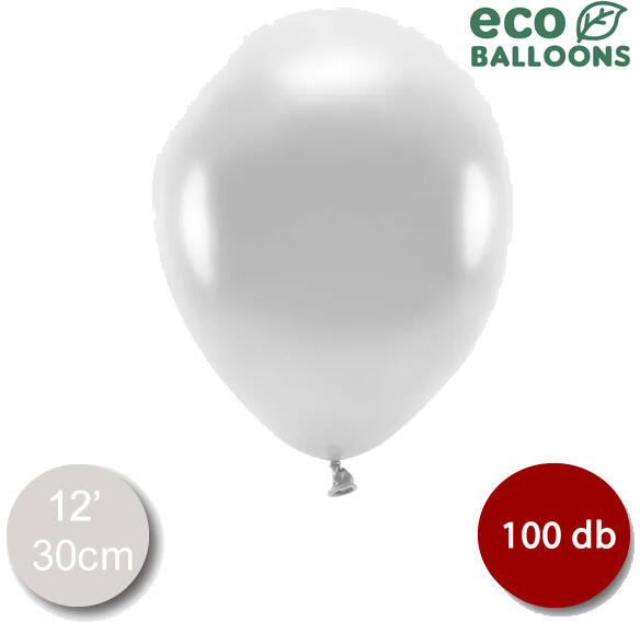 12" Metál ezüst ECO lufi, levegővel vagy gázzal való feltöltésre alkalmas átmérő: 30 cm. 100 db/csomag. Anyaga: Latex.