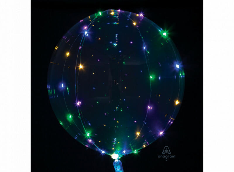 Színesen Világító LED lufi, átlátszó A ballon átlátszó, egy különböző színű LED diódákkal rendelkező dróttal körülvéve. Lufi mérete: 40x40 cm LED szalag: 5 m A lufi tartó pálca + csésze külön megvásárolható áruházunkban DPA9911929.