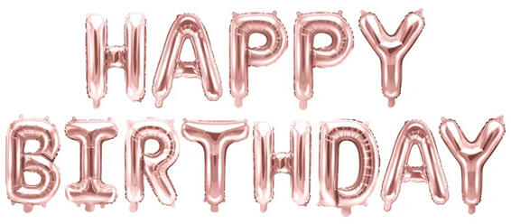 Fólia lufi, Happy birthday. Csak levegővel fújható, önzáró szelepes. A csomag 13 betűt és az öszefűzéshez szükséges zsinórt is tartalmazza. Betű színek: rose gold. Egyedi eurófüles csomagolásban.