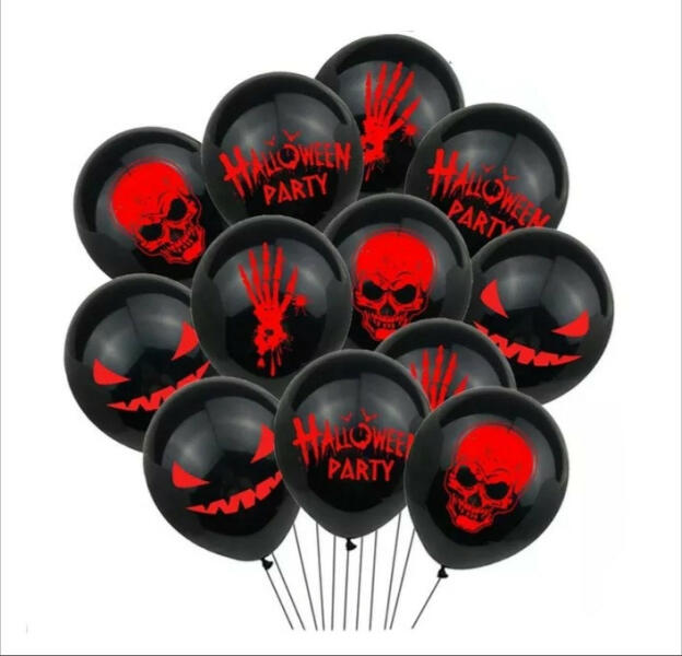 Halloween hangulatú latex lufi csomag. Vegyes, csontváz kéz, koponya, gonosz halloween tök arc és felirat a csomagban, . 12 db, fekete. Anyaga : Latex Levegővel felfújva és zárt térben, átlagosan 18°C hőmérsékleten tartva tovább bírja felfújva.