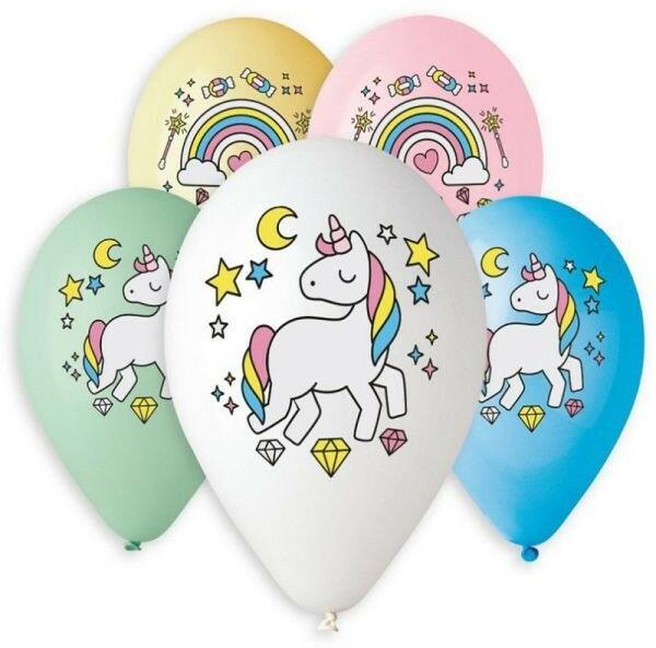 Színes, prémium léggömbcsomag unikornis és szivárvány mintával. Tökéletes kiegészítője lehet a szülinapi, névnapi mulatságoknak vagy tematikus buliknak. A léggömbök héliummal és levegővel is felfújhatók. A csomag 5 darab lufit tartalmaz, amelyek színei véletlenszerűek. Anyaga: 100% latex Felfújt mérete: 33 cm
