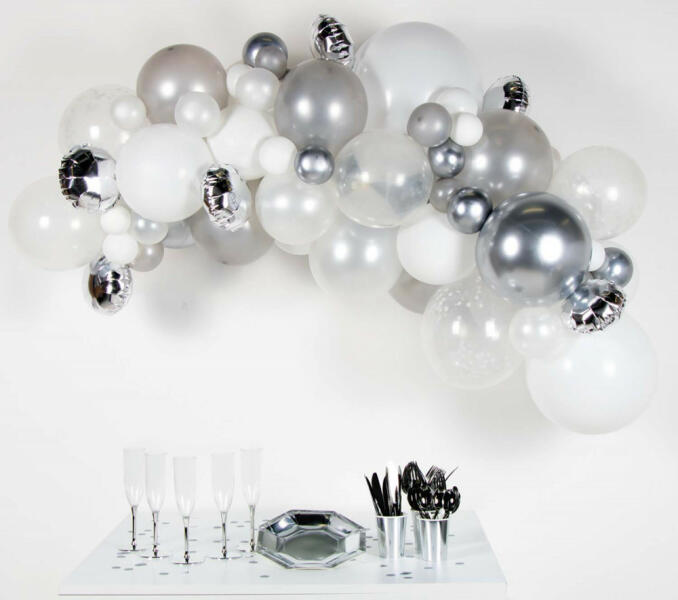 Silver léggömb, lufi girland 66 db-os szett Anyaga: latex/gumi Tartalma: - matricák - léggömb szalag (4 m) - 66 db lufi (különböző méret)