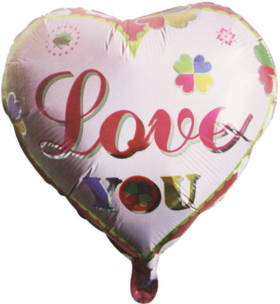 Fólia lufi, 18"/45 cm, szív forma, I Love Love felirattal. Önzáró szelepes, tölthető levegővel vagy héliummal. Egyedi eurofüles csomagolásban.
