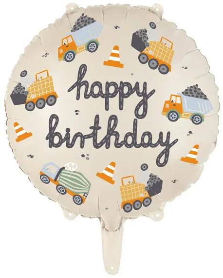 Fólia lufi, 18"/45cm, gömb forma. Happy Birthday felírattal, munkagépes mintával. Héliummal vagy levegővel fújható, önzáró szelepes. Egyesével csomagolva.
