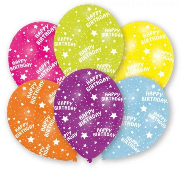 Happy Birthday léggömb, lufi 6 db-os Anyaga: latex/gumi Mérete: A lufi tartó pálca + csésze külön megvásárolható áruházunkban (DPA9911929).