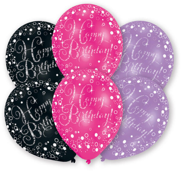 Latex lufik Happy Birthday rózsaszín/fekete/lila Lufik egyedi és esztétikus kiegészítője minden partinak vagy társadalmi eseménynek . Készítsen lufi díszítést a szülinap napján és varázsoljon egy feledhetetlen napot az ünnepeltnek és vendégeinek. alkalmas héliummal és levegővel való felfújásra darab : 1 drb méret: 30 cm