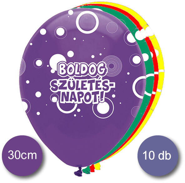 Színes lufi, Boldog születésnapot (fehér) felirattal. Átmérő: 30 cm. Tölthető gázzal, levegővel. Teljes felületen mintázott. Vegyes színekben csomagolva. Egy csomagban 10 db van, vegyes színekben.